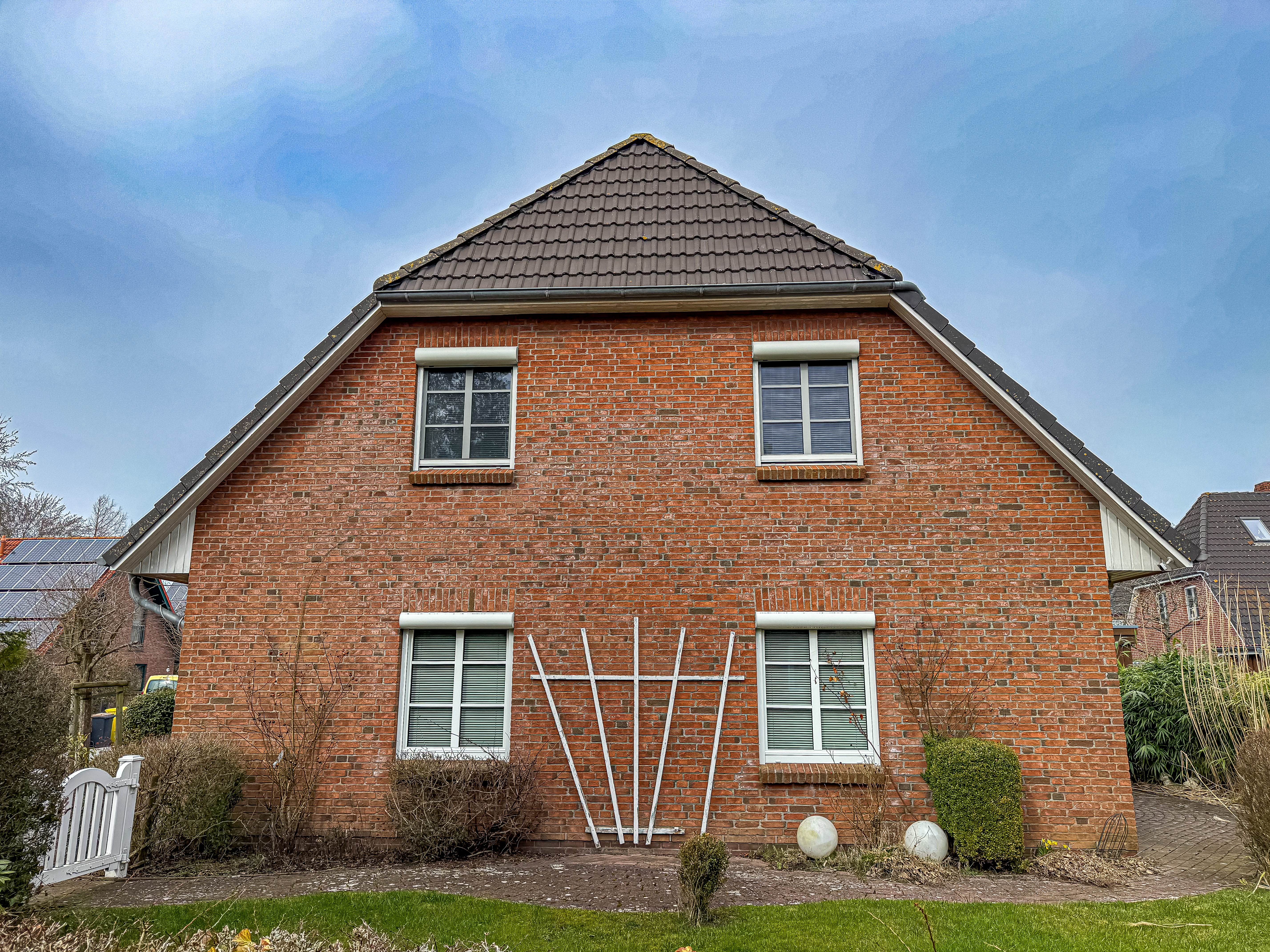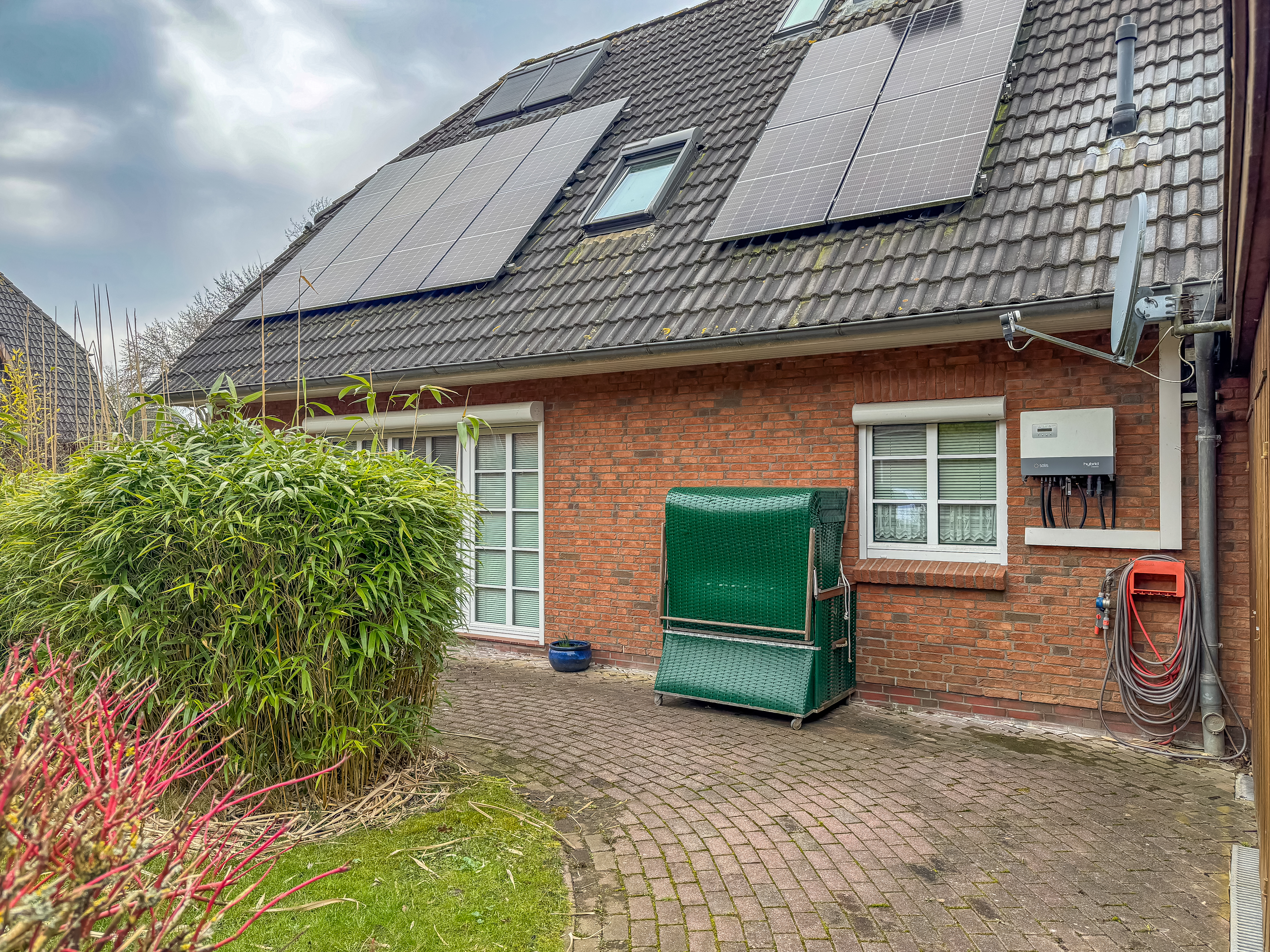 Ca. 1998 errichtetes freistehendes Einfamilienhaus mit ausgebautem Dachgeschoss. Nicht unterkellert. Krüppelwalmdach mit harter Dacheindeckung. Rotsteinverblender. Kunststofffenster mit Isolierverglasung. Außenjalousien. Einbauküche mit Hänge- und Unterschränken und Elektrogeräten. Gaszentralheizung im EG als Fußbodenheizung. Photovoltaikanlage, Wallbox im Carport. Kaminofen im Wohnbereich. Keramische Bodenbeläge bzw. Teppichboden. Gepflegte Gartenanlage mit Terrasse. Carport mit angrenzendem Geräteschuppen. Klimaanlage im Dachgeschoss (Schlafzimmer + Büro). Wasserfilteranlage der Firma "Truu".